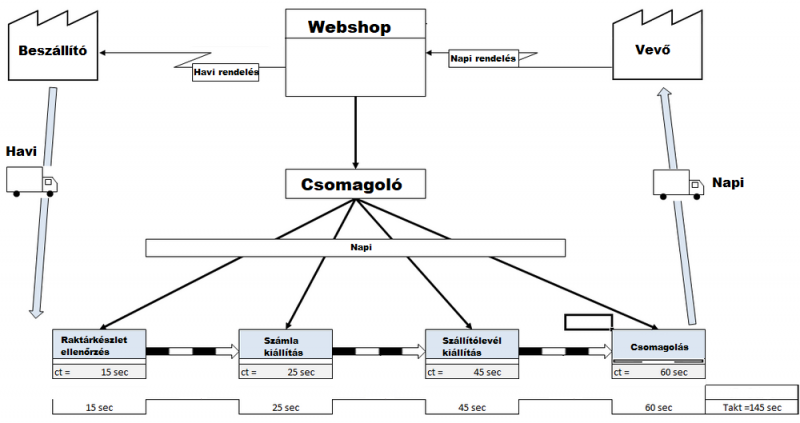 A folyamat leegyszerűsödött: megjön a rendelés, ami csak akkor adható le, ha van is a megvásárolni kívánt áru a raktárban, a dolgozó megnyitja a szoftvert kinyomtatja a számlát és csomagcímkét felkapja a dobozt és lecsomagolja. Megszüntettünk tehát egy szükségtelen folyamatot és automatizáltunk kettő értékteremtést támogatót. Ezzel pedig összesen csomagonként 85 mp időt nyertünk. Ha éves szinten 10000 megrendelésünk van akkor ez összesen közel 10 nap!