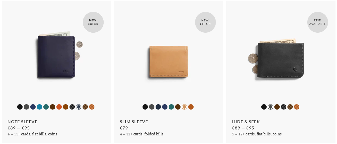 Hogy ezt elérd, minden lehetséges eszközt fel kell használnod. Először is készíts (vagy inkább készíttess) profi képeket a termékről és annak használatáról is! Legyenek esztétikusak, szemet gyönyörködtetőek, vágykeltőek. Érezze azt a vásárló, hogy neki ez kell! A bellroy.com például 9 egyszerű, de igényes képet készített csak ehhez az egy telefontokhoz.